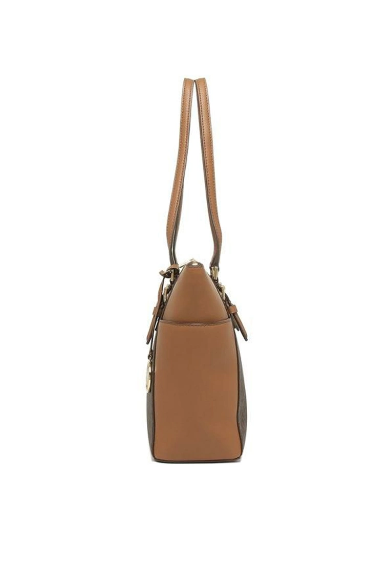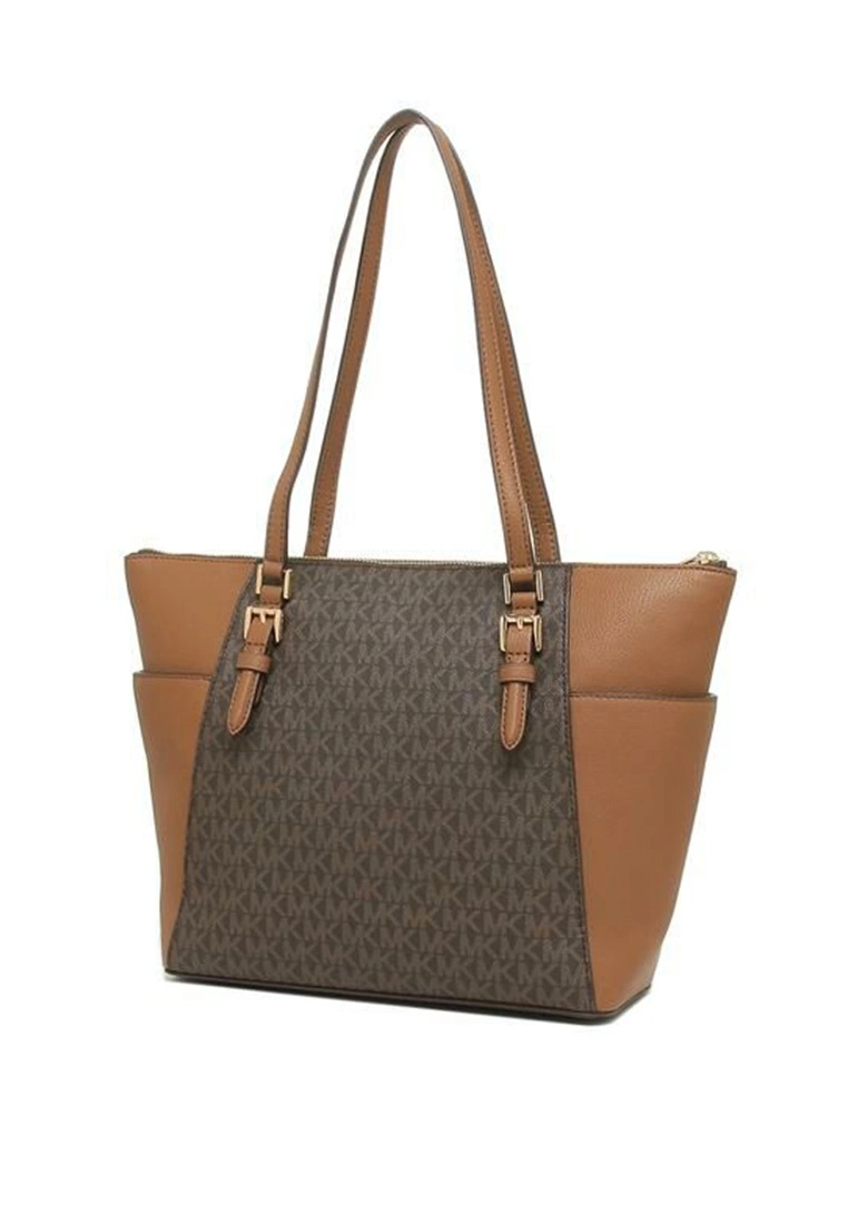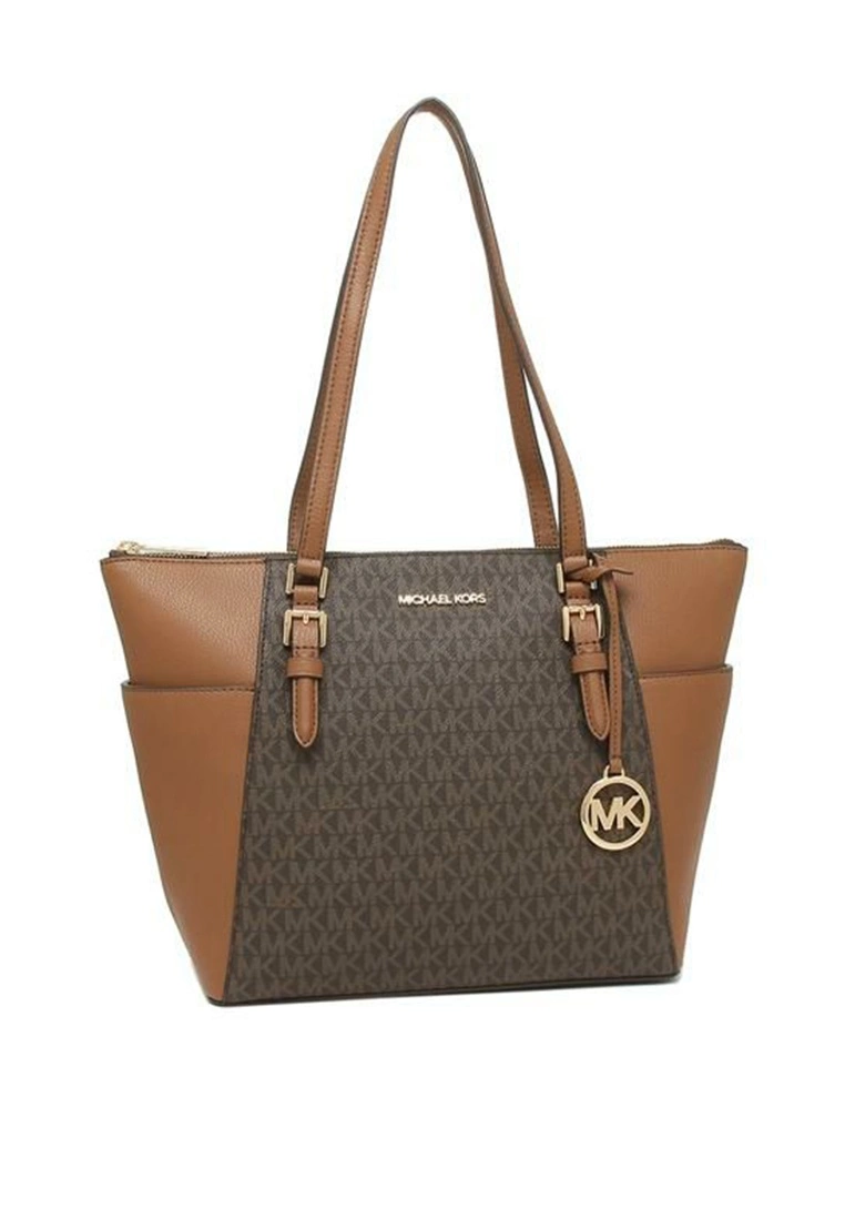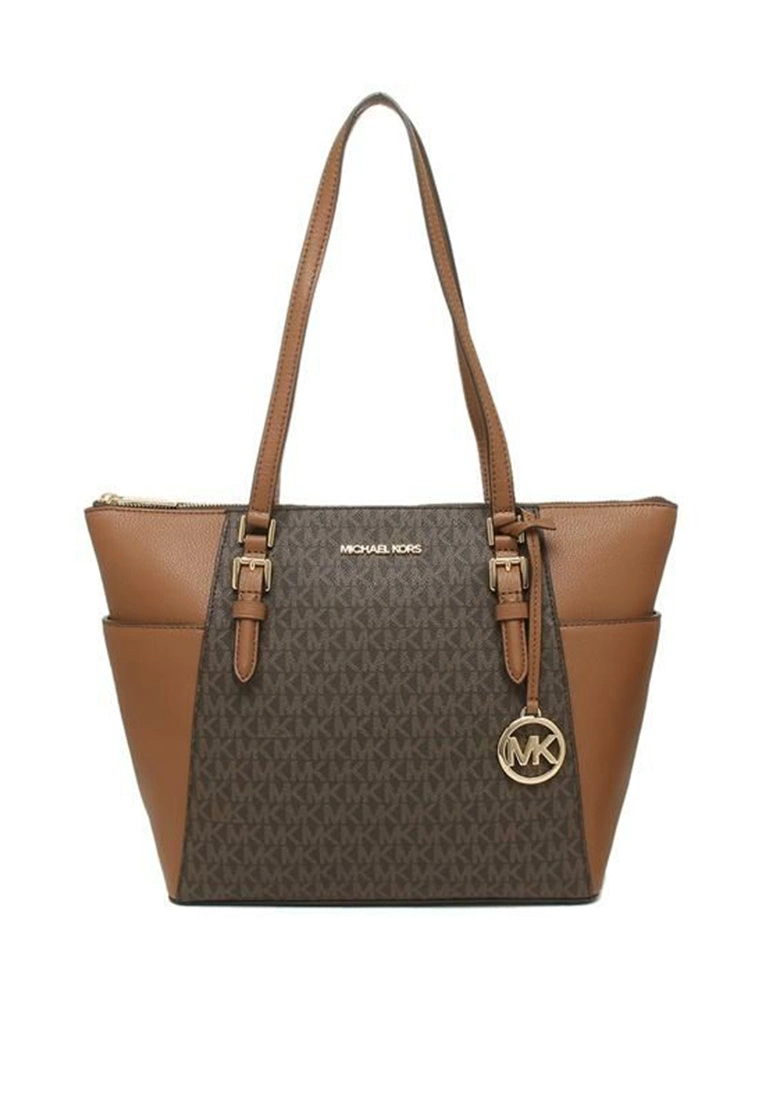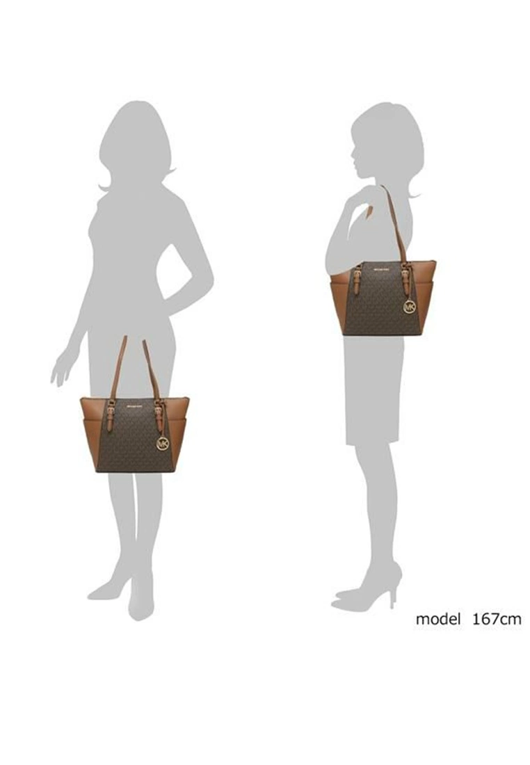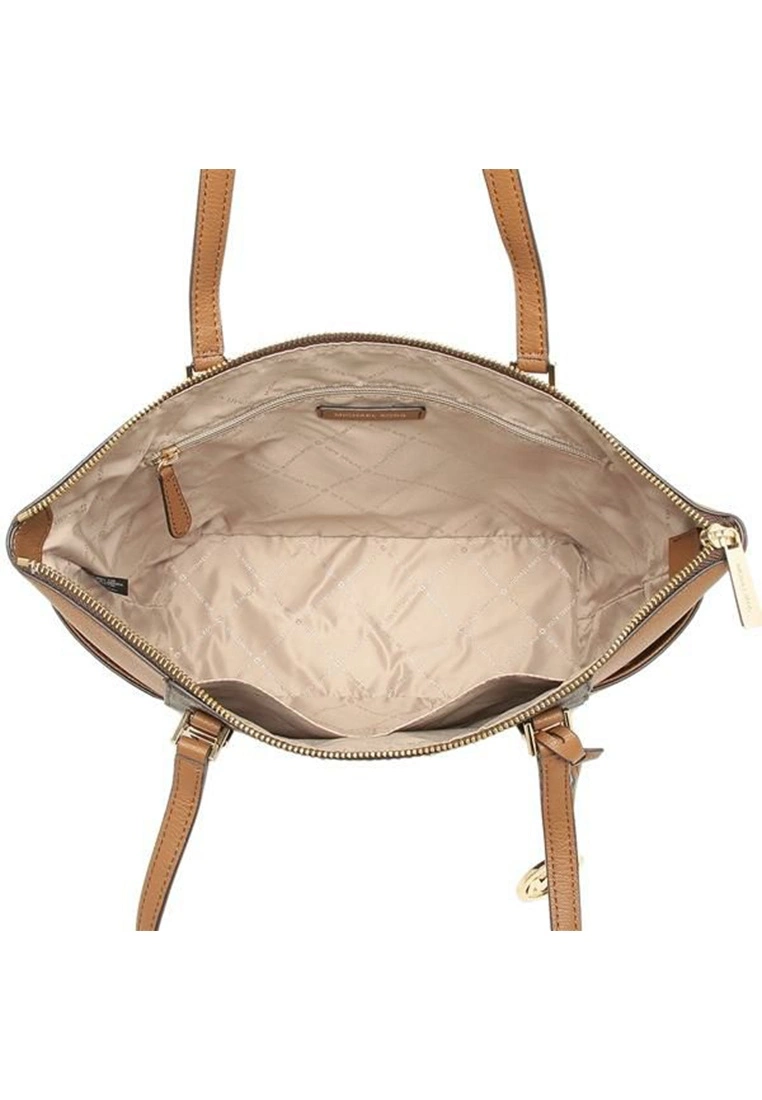 Double shoulder straps with 10″ drop11″W x 10.25″H x 4.5″DInterior 1 zip pocket & 2 slip pocketsExterior slip pockets on each endMK logo signature fabric liningPolished gold-tone hardwareMichael Kors Logo on FrontMk signature coated canvas with geniune leatherZip top closureFabric lining
