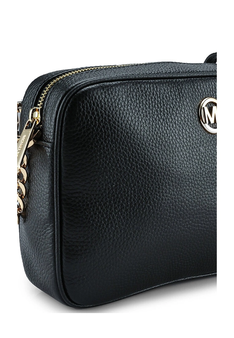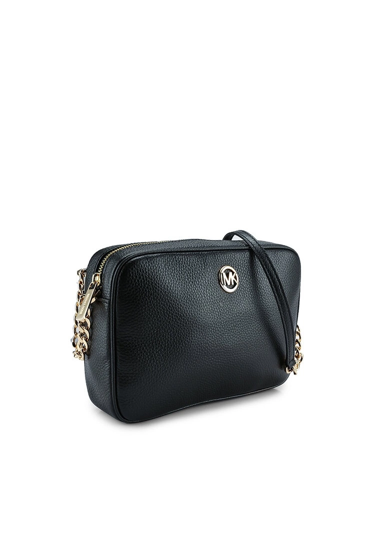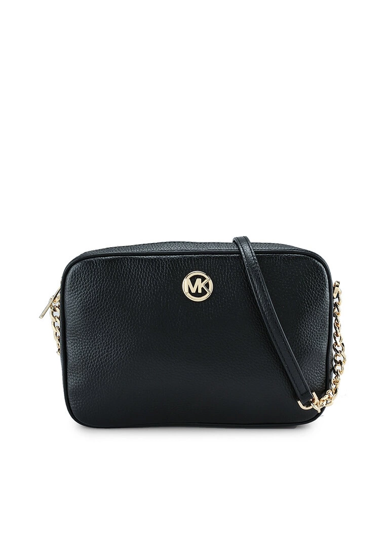 – Solid shade pebbled leather crossbody bag with brand metal hardware
