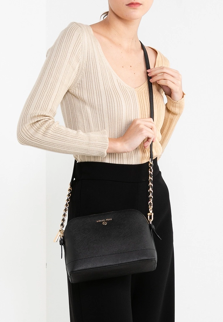 – Solid-tone bag with golden hardware