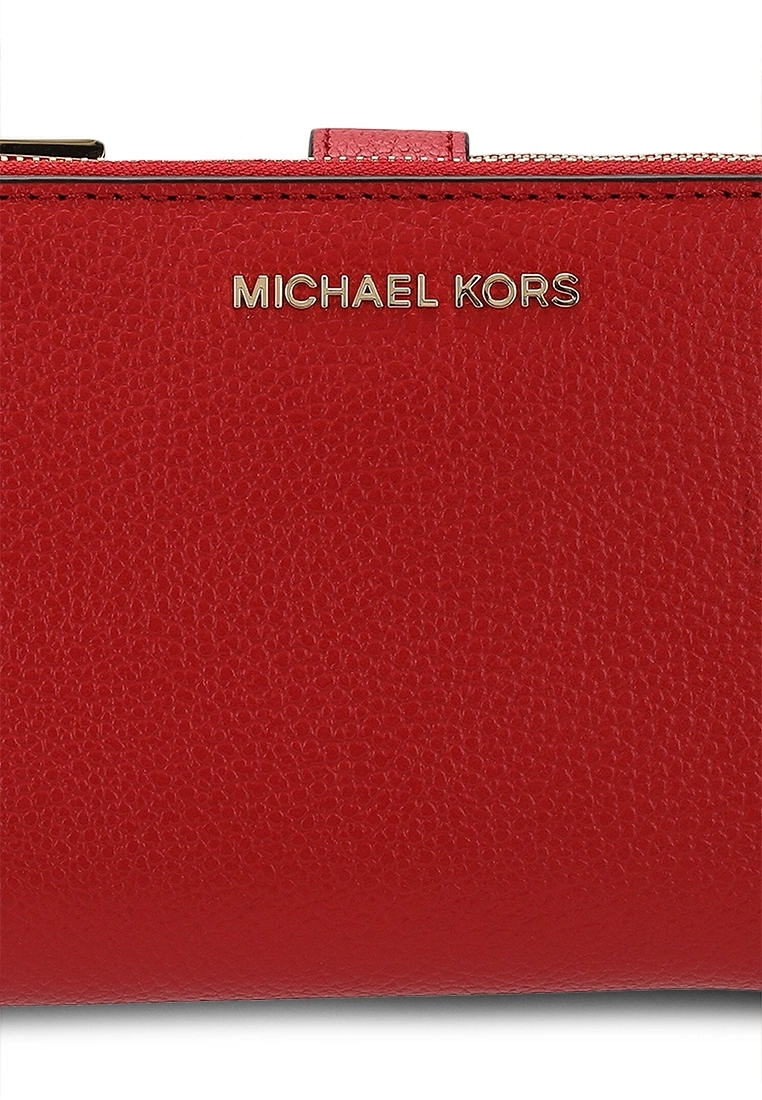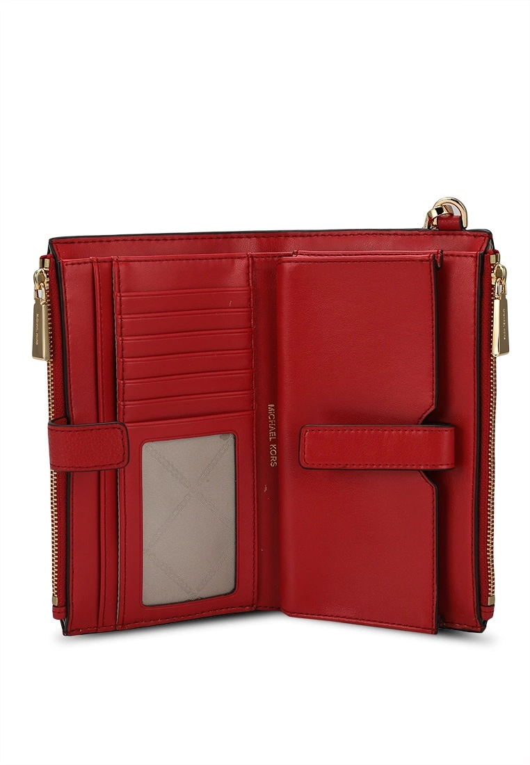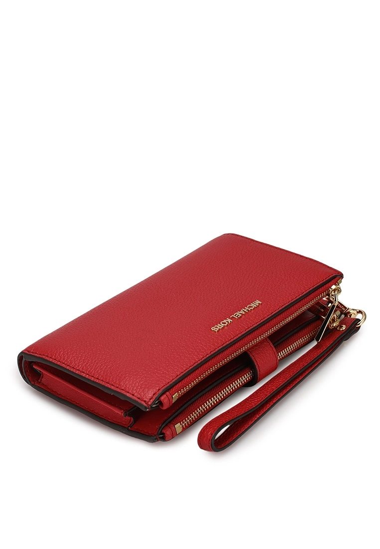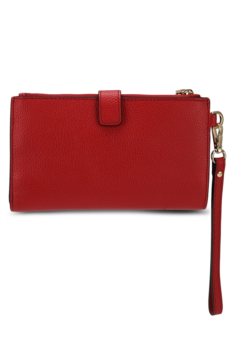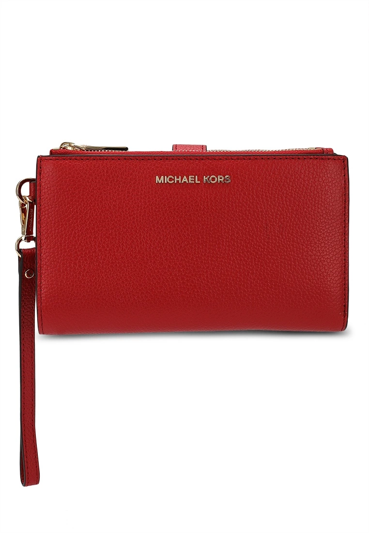 – Solid shade pebbled double zip wristlet with logo applique