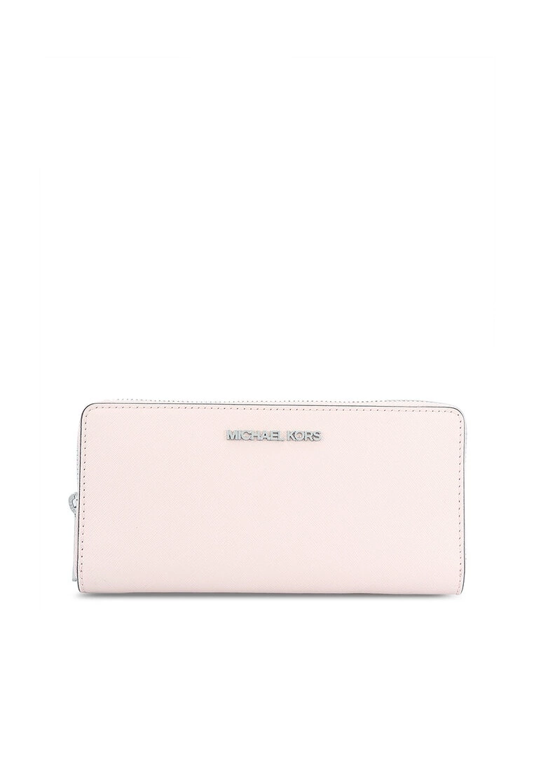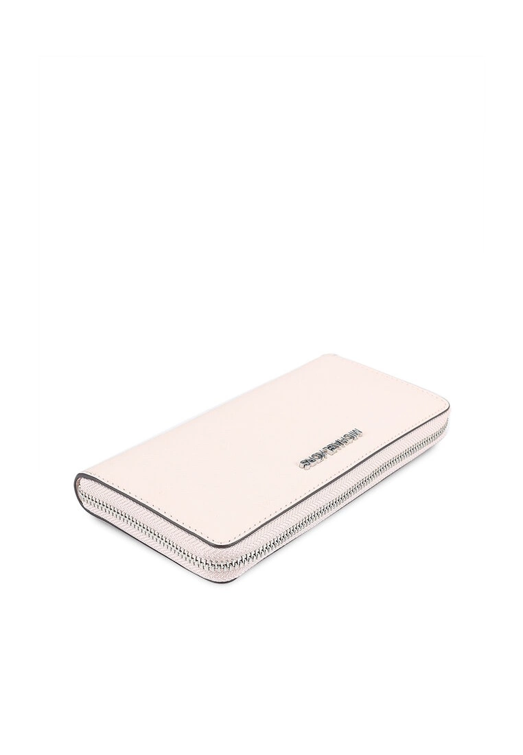 – Solid hued textured long wallet with brand applique