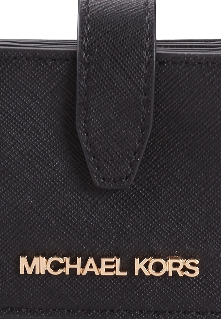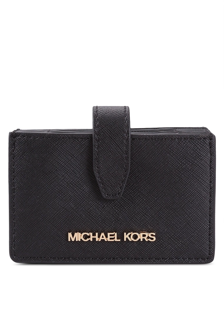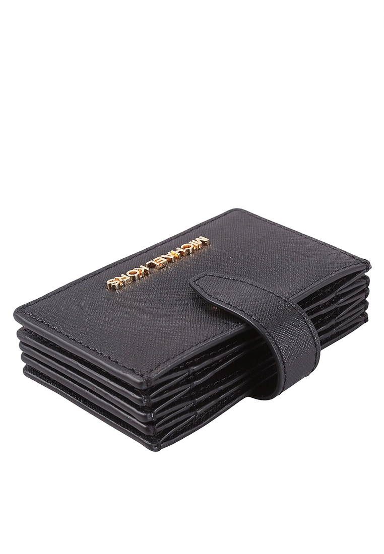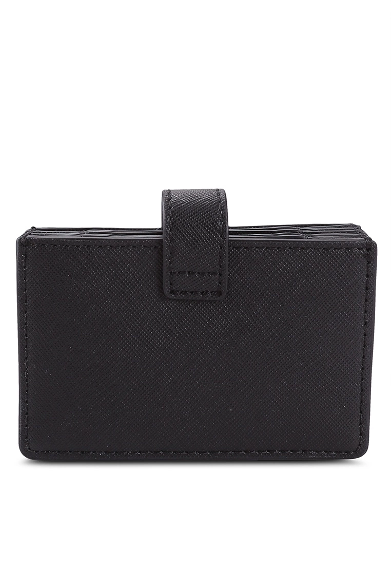 – Solid shade textured expandable card case with metal logo
