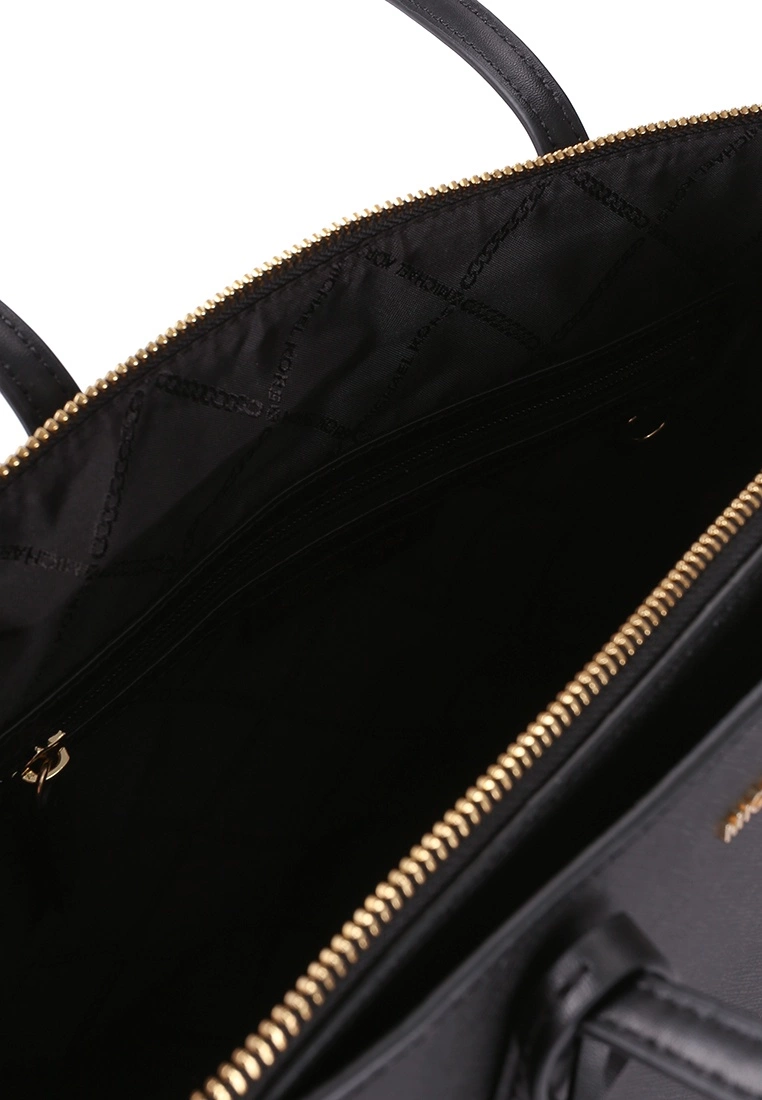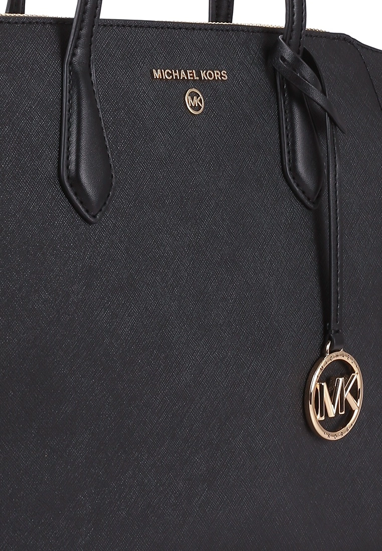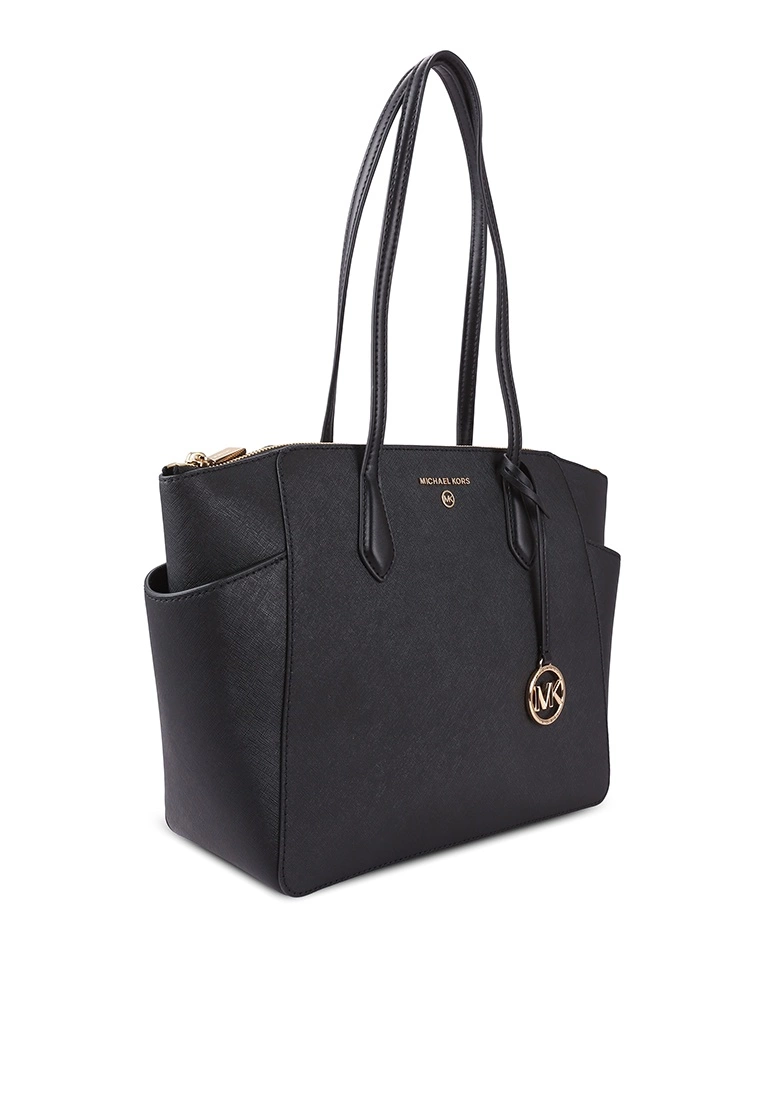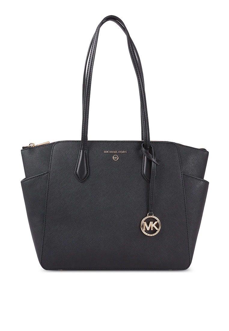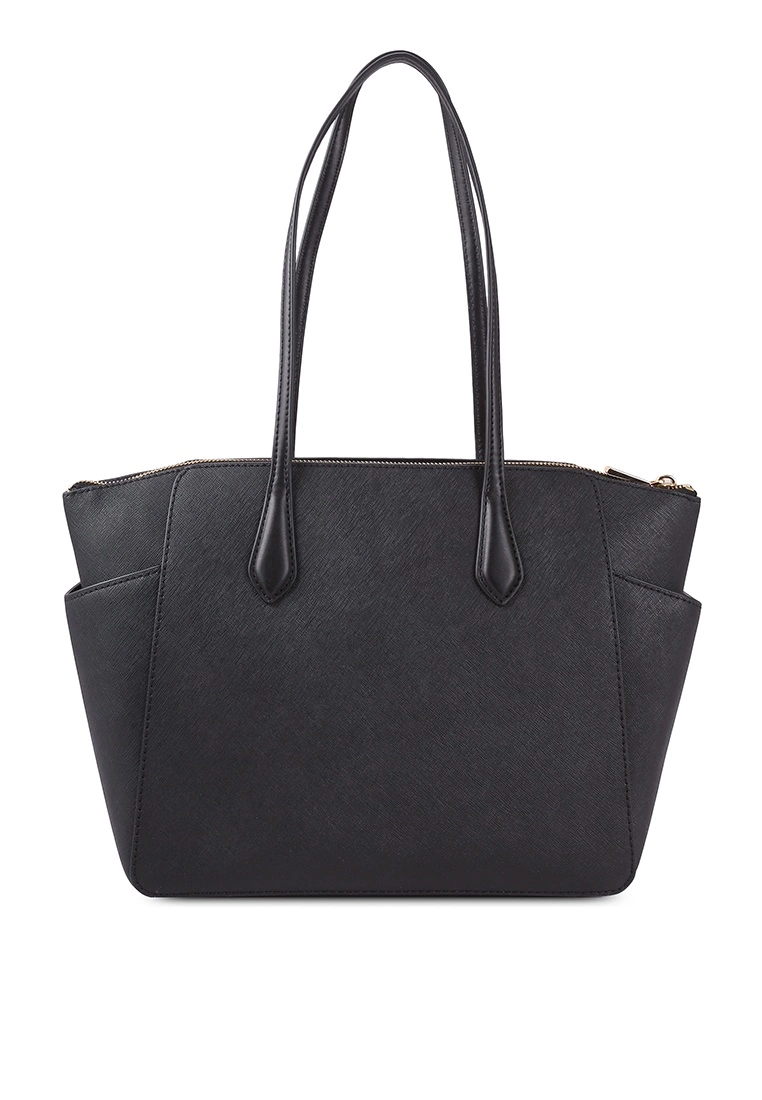 – Solid shade pebbled tote bag with logo applique