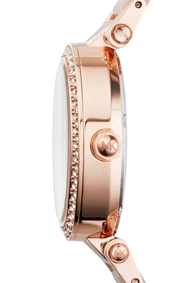 Taking both modern aesthetics and classical style, this watch by MICHAEL KORS is made of stainless steel case and bracelet to add a feminine charm. The sparkly embellished dial makes it an fancy accessory to go with just about everything.