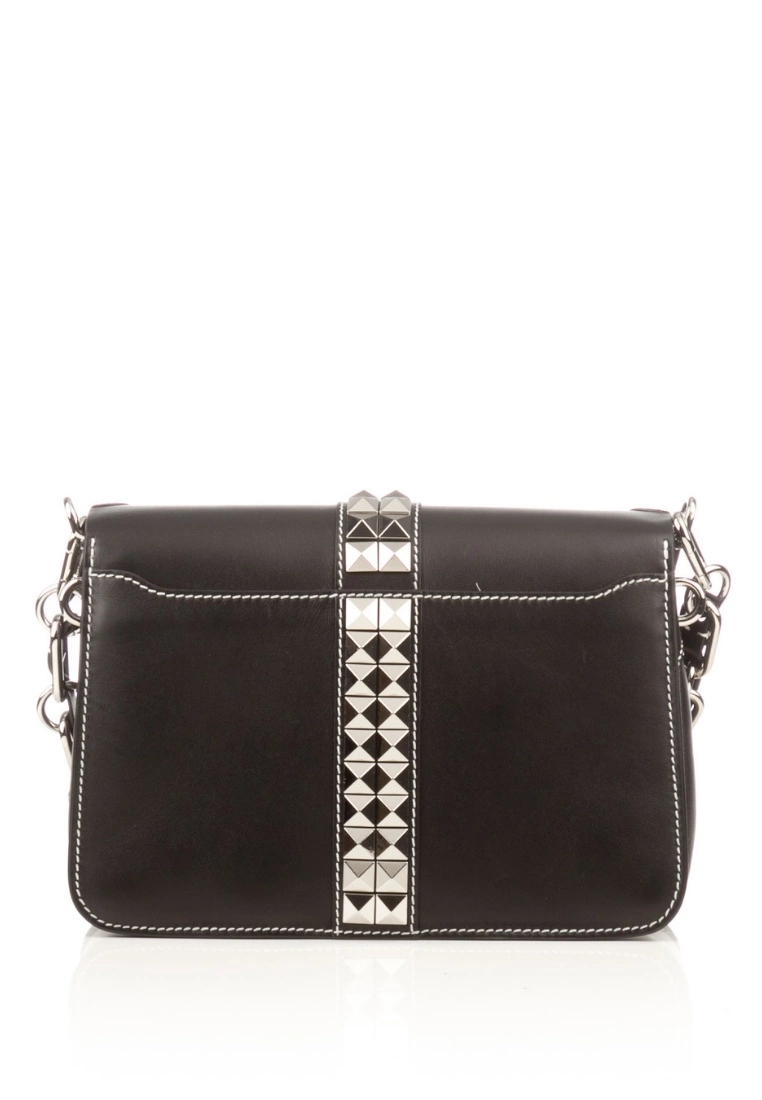 This is an authentic pre-owned MICHAEL KORS Black Studded Crawford Leather Small Shoulder Bag. A structured shape with a touch of edge, the Crawford crossbody bag is the perfect complement to myriad looks. It is crafted in Italy from smooth calf leather in a top flap silhouette detailed with pyramid studs and a chain-link handle. Multiple interior pockets render this essential for every day.