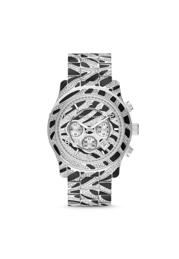 Michael Kors’ Runway 45mm watch features a zebra-print dial with glitz and black enamel details, with silver-tone stick and numeral indexes, chronograph movement and zebra-print stainless steel bracelet wth glitz and black enamel