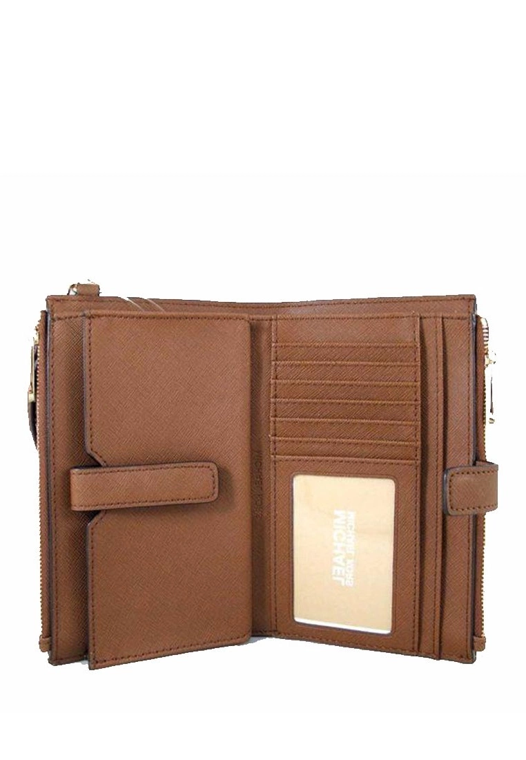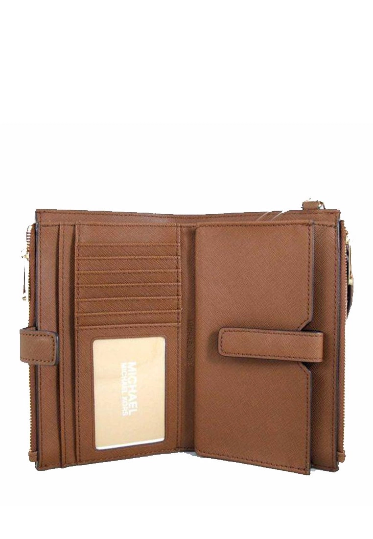 -Interior features 1 ID window pocket, 6 credit card slots, 2 slip pockets, 1 phone pocket, 1 large open compartment and 2 zip compartments.